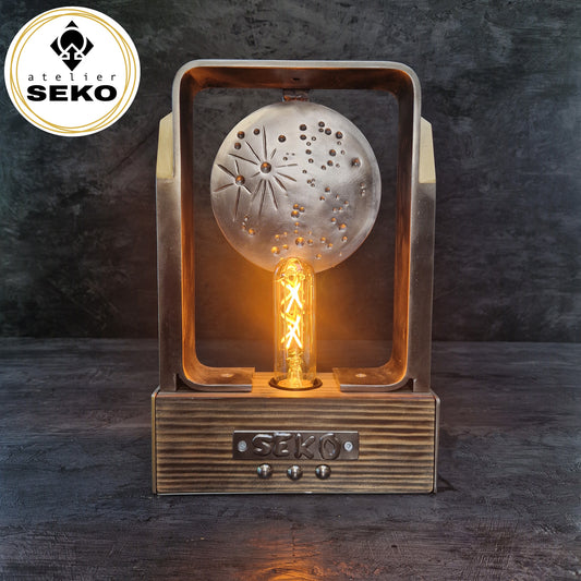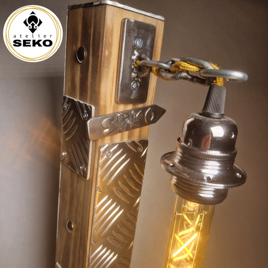 Métal, bois, pièces mécaniques et textures contrastées se mêlent harmonieusement pour donner naissance à des luminaires UNIQUES!
