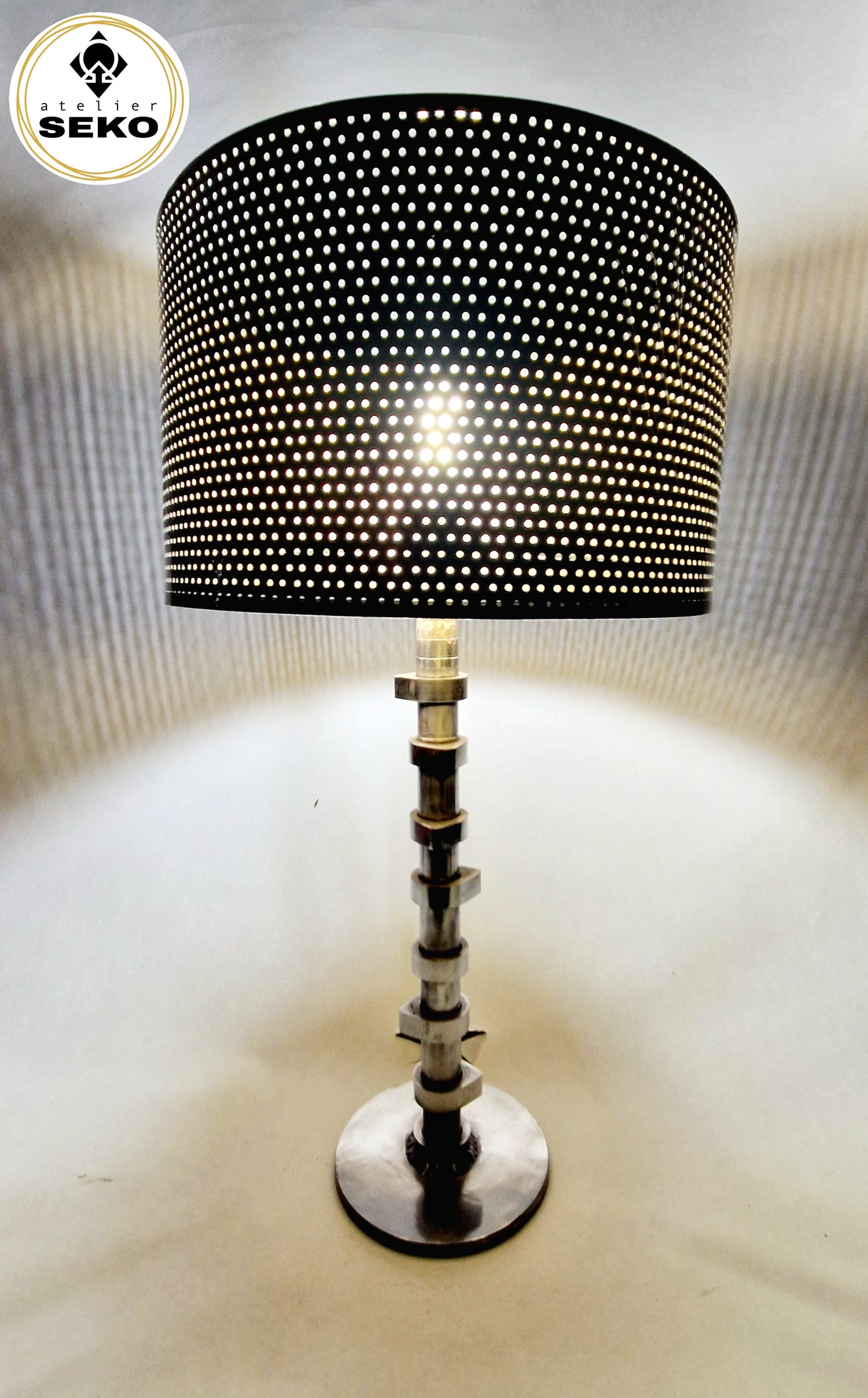 Avec son allure industrielle distinguée, NEXUS offre un mélange parfait entre robustesse mécanique et raffinement esthétique. Son abat-jour perforé diffuse une lumière tamisée, idéale pour créer une ambiance chaleureuse et sophistiquée.